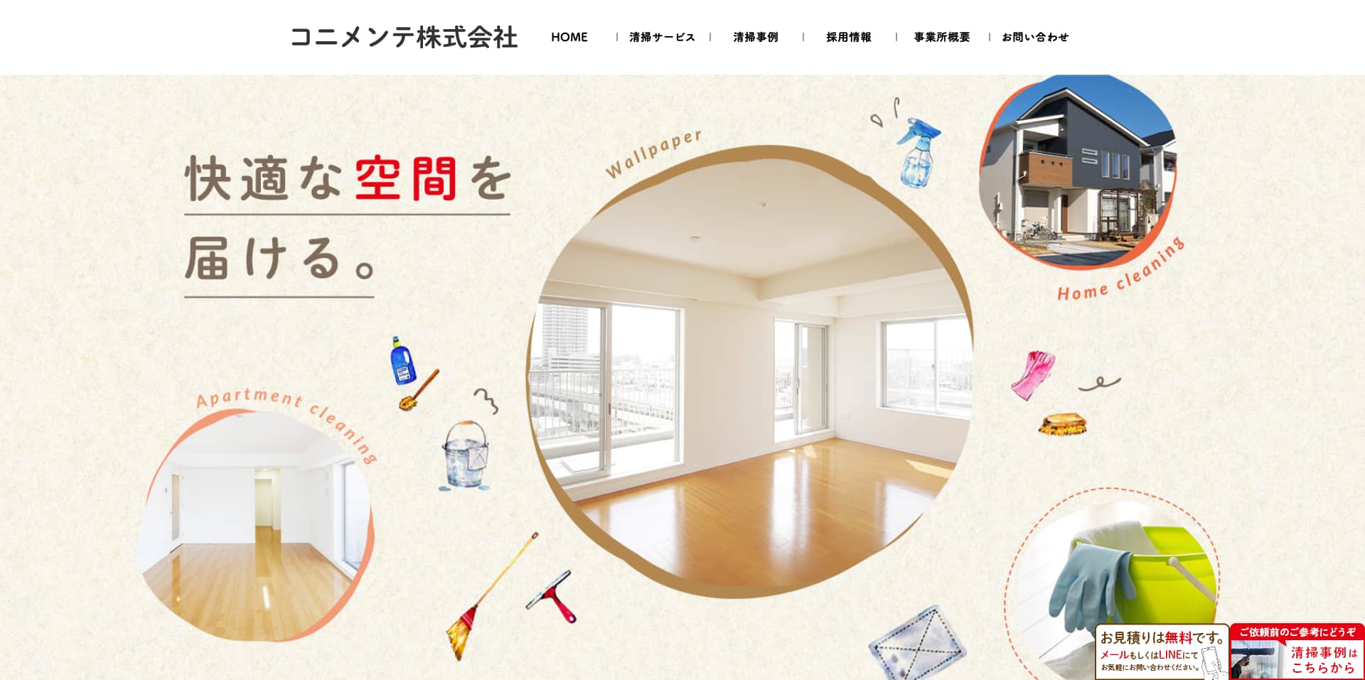 コニメンテ株式会社は、広島県を拠点に高品質なハウスクリーニングサービスを提供する専門業者です。「隅々まで丁寧に、隅々まで美しく」をモットーに、プロの技術と専用道具を駆使し、キッチン・浴室・トイレなどの水回りを中心に、頑固な汚れも徹底的に除去します。特に賃貸物件の空室清掃や新築美装の分野で豊富な実績を持ち、原状回復やクロス・床の張替えなどの軽微な工事にも対応。