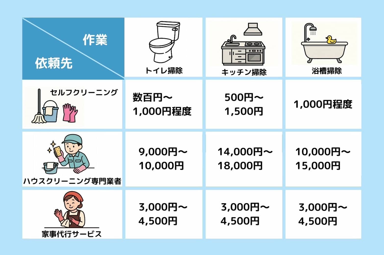 セルフクリーニングは最も費用がかからない方法で、必要なのは洗剤や道具代のみです。例えば、トイレ掃除は洗剤・ブラシ等で数百円〜1,000円程度、キッチン掃除は重曹やクレンザー、スポンジなどで500円〜1,500円、浴室掃除はカビ取り剤・洗剤・ブラシなどで1,000円程度。ただし、手間と時間がかかり、汚れの落ちに限界があるのがデメリットです。