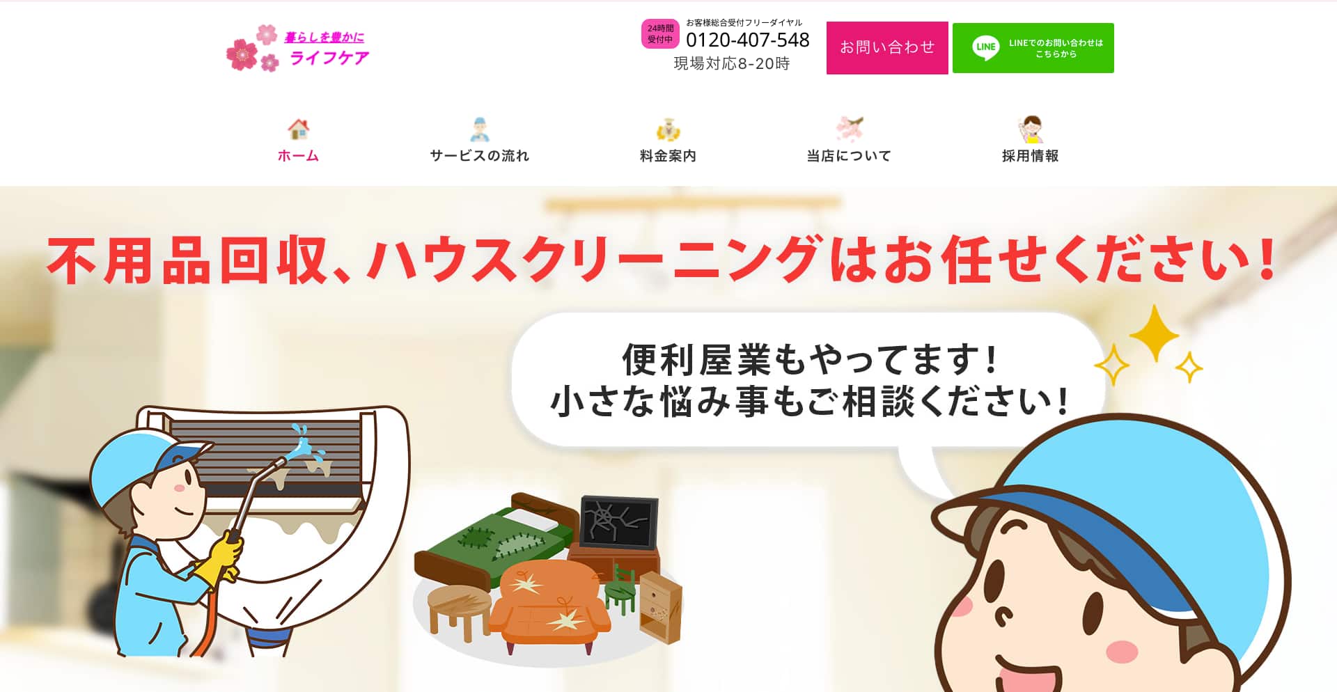 | サービス内容 | エアコン、浴室、洗面所、レンジフード、キッチン、トイレなど |