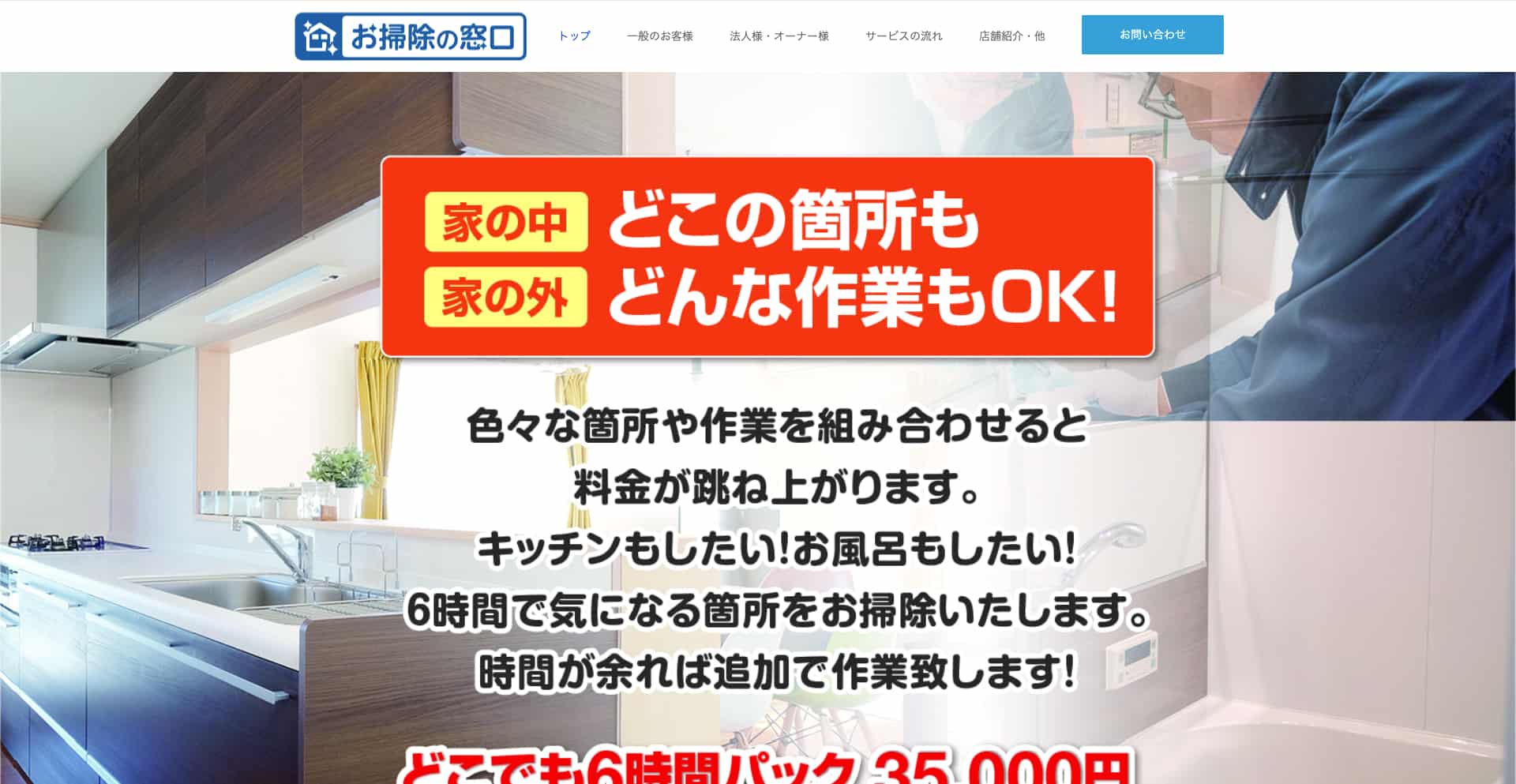 | サービス内容 | エアコン、キッチン、換気扇、浴室、トイレ、洗濯機、洗面台、ガラスサッシ、フロアコーティングなど |