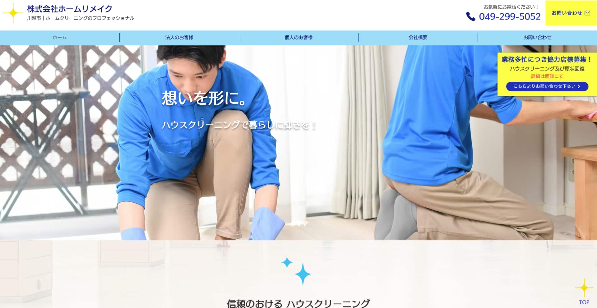 株式会社ホームリメイクは、埼玉県川越市を拠点に、豊富な実績を誇る清掃専門会社です。住宅・施設の清掃全般を「暮らしに輝きを与える」作業と捉え、エアコン・キッチン・浴室・トイレなどの水回りをはじめ、窓・床・ベランダ・レンジフードといった細かな部分まで丁寧に対応しています。