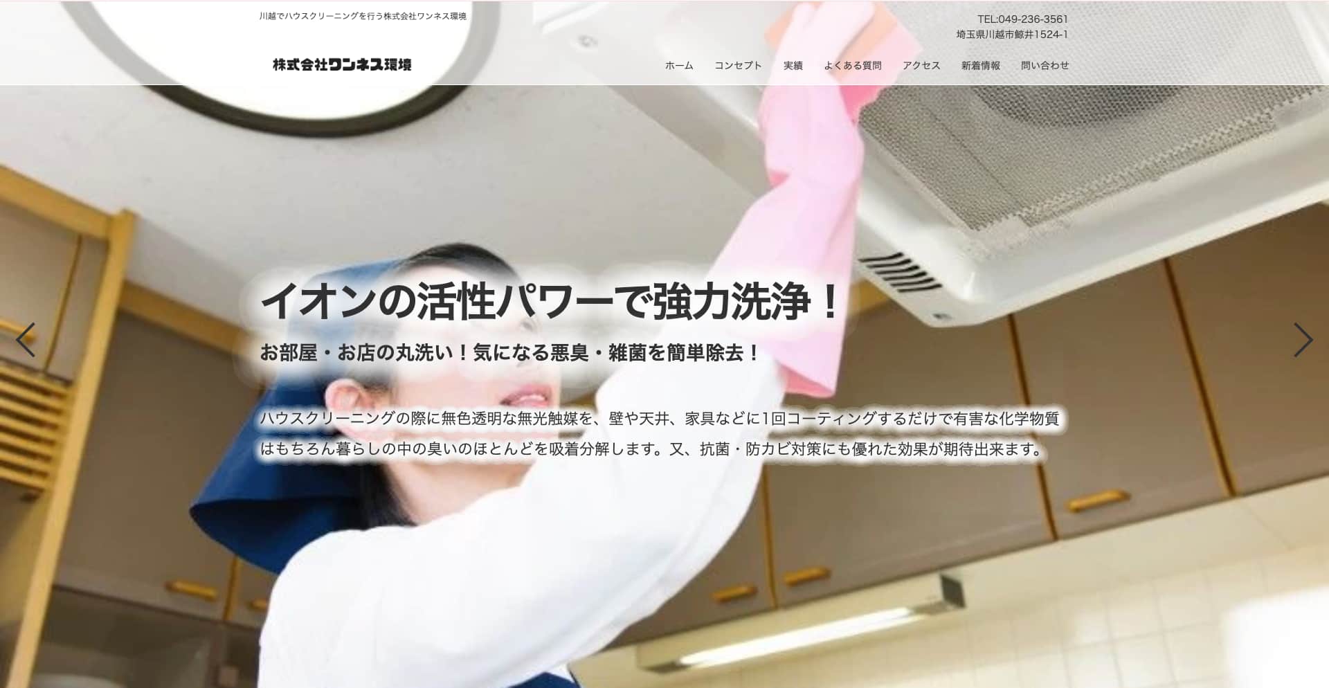 株式会社ワンネス環境は、埼玉県川越市を拠点に、地域に根ざしたハウスクリーニング専門会社として、「暮らしの中の臭いや雑菌・カビを根本から解決する」ことを使命としています。無色透明な「無光触媒」コーティングによる清掃技術が特徴です。壁や天井、家具に一度コーティングすることで、タバコや揮発した食用油、体臭・生活臭などの原因物質を吸着・分解し、さらに抗菌・防カビ・静電気防止も期待できます。