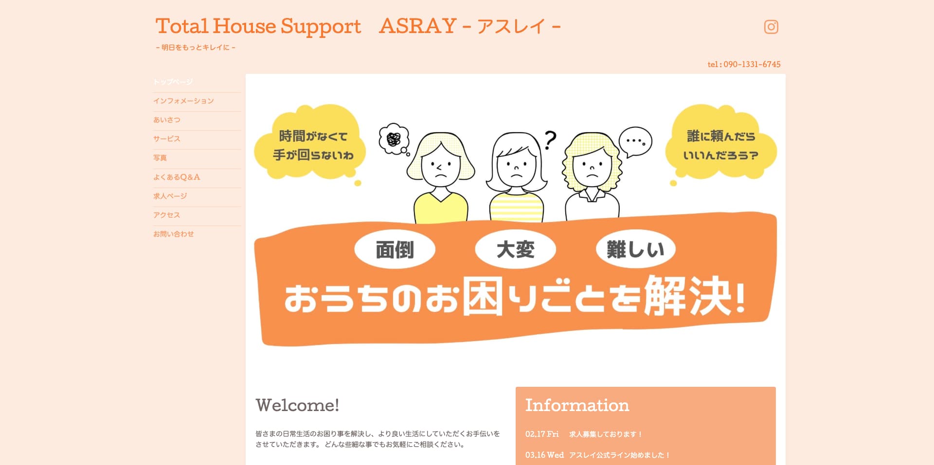 「ASRAY」は、日常生活のあらゆるお困りごとに対応する総合生活サポート企業です。主なサービスには、ハウスクリーニング、水回りのトラブル対応、庭の手入れ、各種代行業務、内装工事、リフォームなどがあり、個人から法人まで幅広いニーズに応えています。特に、アパートやマンションの入退去時の清掃や共用部の巡回清掃など、清掃業務全般に強みを持っています。また、スタッフ一人ひとりの丁寧な対応と柔軟なサービスが、多くのリピーターや口コミによる高評価に繋がっています。