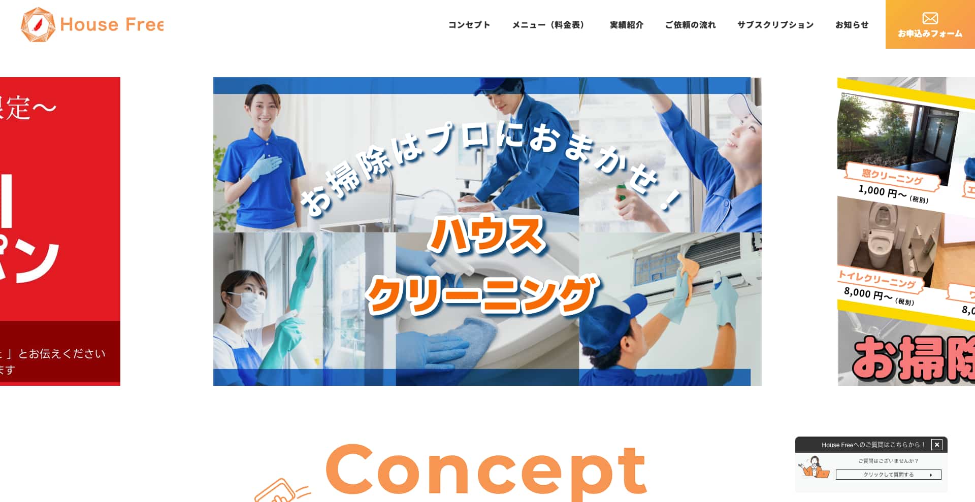 | サービス内容 | エアコン、日常お掃除代行サービス(キッチン、レンジフード、浴室、洗い物、トイレ、掃除機、窓拭きなど家事全般) |