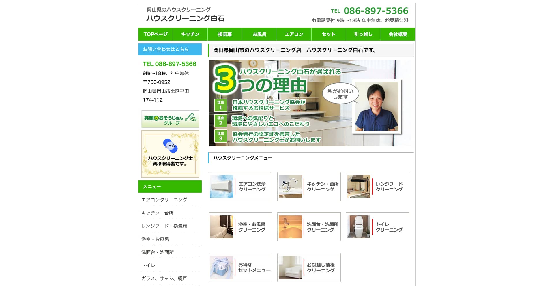 「ハウスクリーニング白石」は、岡山県を拠点に、地域に密着したハウスクリーニングサービスを展開しています。「人と地球に優しい洗浄」を理念に、水まわり、レンジフード・換気扇、エアコンなど幅広く対応し、住まい全体の衛生環境をトータルサポートしています。天然植物由来の洗剤を中心に使用し、化学物質による環境負荷を抑える配慮を大切にしています。