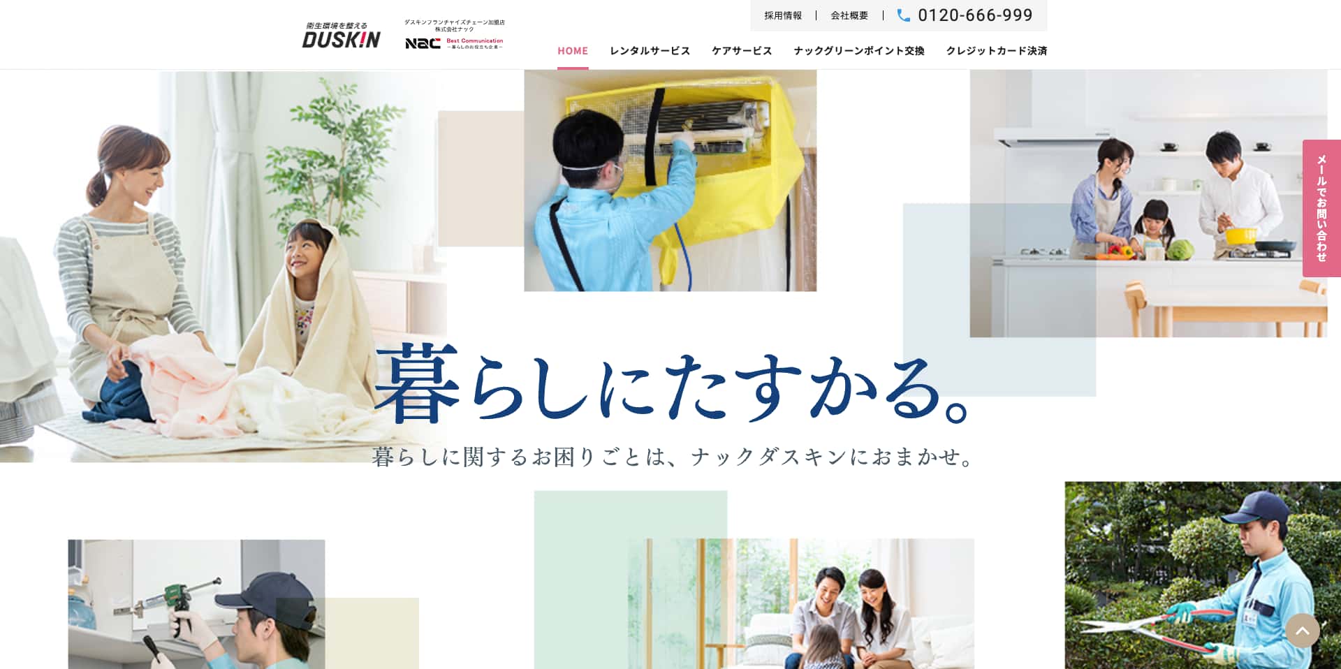また、女性スタッフの指名サービスや、定期的な訪問プランも用意されています。「ナック・ダスキン」は、ダスキンブランドの信頼性とナック独自のサービス品質を兼ね備え、顧客満足度の高いハウスクリーニングを提供しています。清掃サービスの他にも、家事代行や庭の手入れ、害虫駆除など、暮らしに関する幅広いサービスを展開しており、総合的な生活サポートを行っています。