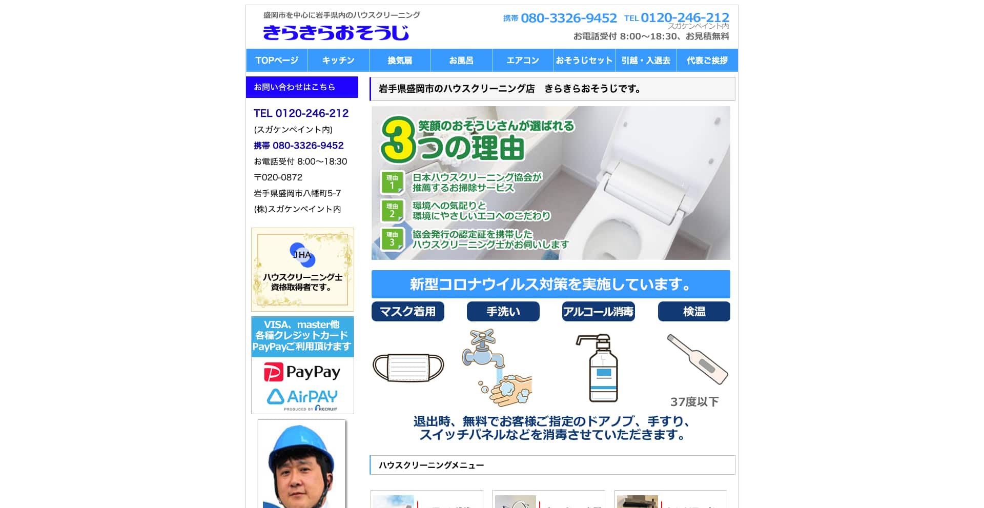 | サービス内容 | エアコン、キッチン、換気扇、浴室、トイレ、洗面所、洗濯機、ベランダ、玄関、ガラス・サッシ、除雪、雑草除去、リフォームなど |