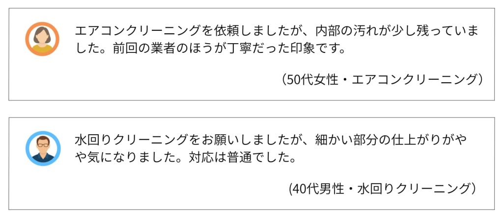 くらしのマーケットの悪い評判で見られるのが、「業者によって仕上がりや対応に差がある」という口コミです。くらしのマーケットは出店者と直接契約するマッチング型サービスのため、技術力や接客姿勢は業者ごとに異なります。