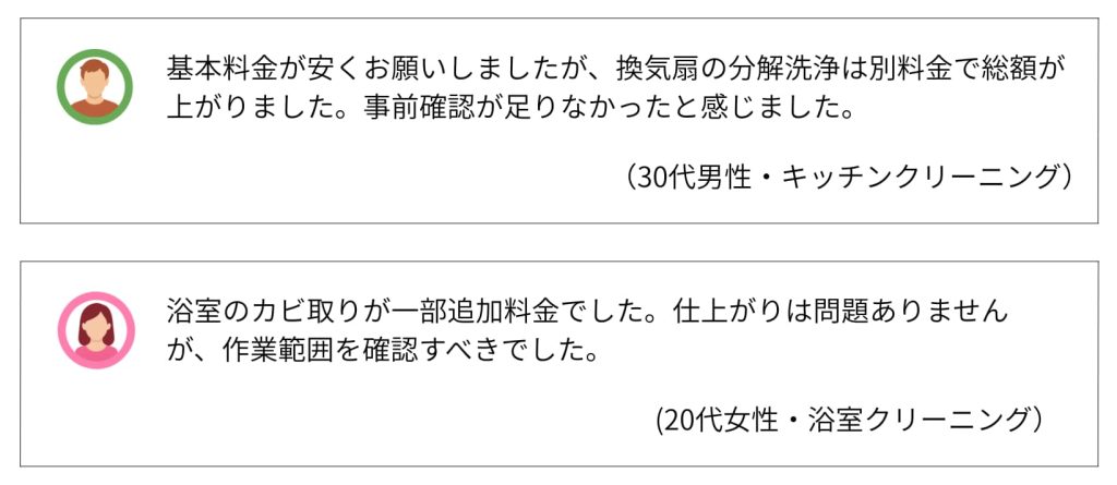 - A悪質な追加請求は多くありません。多くはハウスクリーニングの作業範囲やオプション料金の認識違いが原因です。