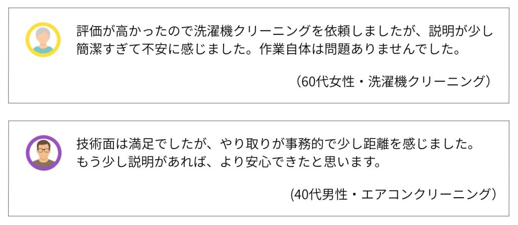 くらしのマーケットの口コミには、「評価は高かったけれど、自分とは少し相性が合わなかった」という声も一部あります。くらしのマーケットは出店者と直接やり取りする仕組みのため、対応の雰囲気や説明の仕方は業者ごとに違います。人柄や伝え方の違いも影響しますね。