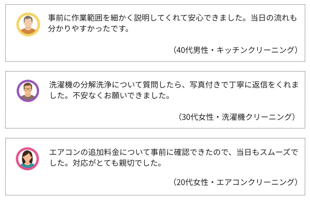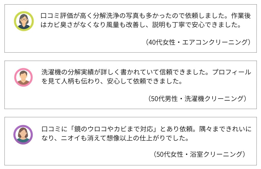 くらしのマーケットの良い評判では、「口コミやプロフィールを見て選べたので安心だった」という声が多くあります。