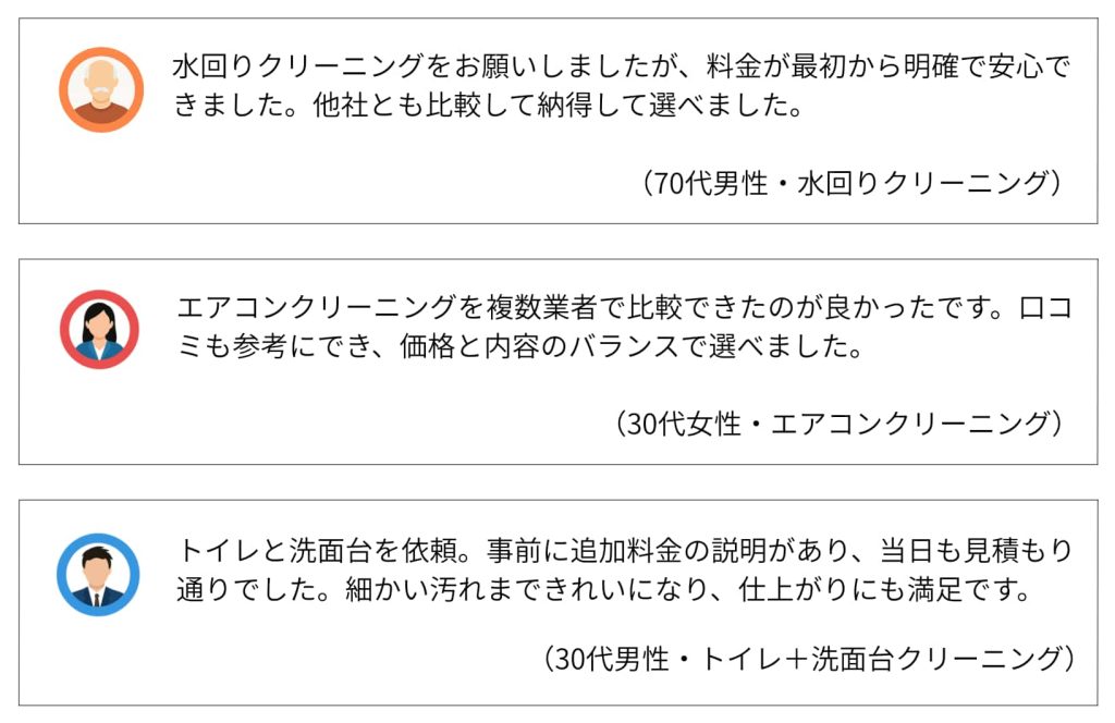 くらしのマーケットの良い評判で目立つのが、「仕上がりに満足した」という口コミです。料金や口コミを比較して自分で業者を選べるため、納得したうえで依頼できるのが強みですね。