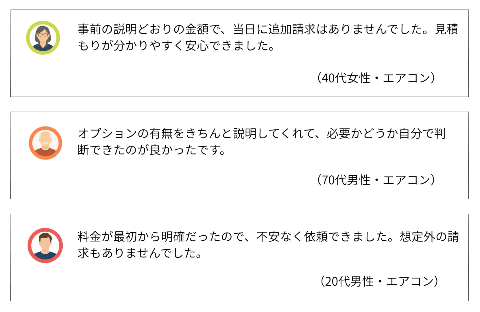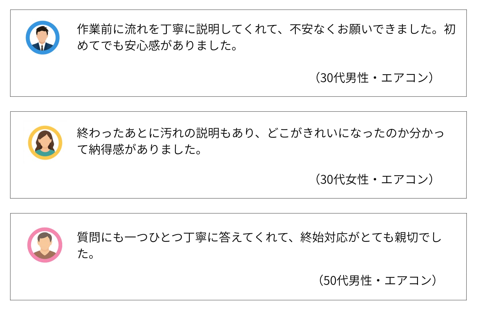 また、作業前後の説明が丁寧だったという口コミも多く、「何をしてくれるのか分からないまま進むのが不安」という人にも適しています。料金や作業内容を事前に確認しやすい点も安心材料です。