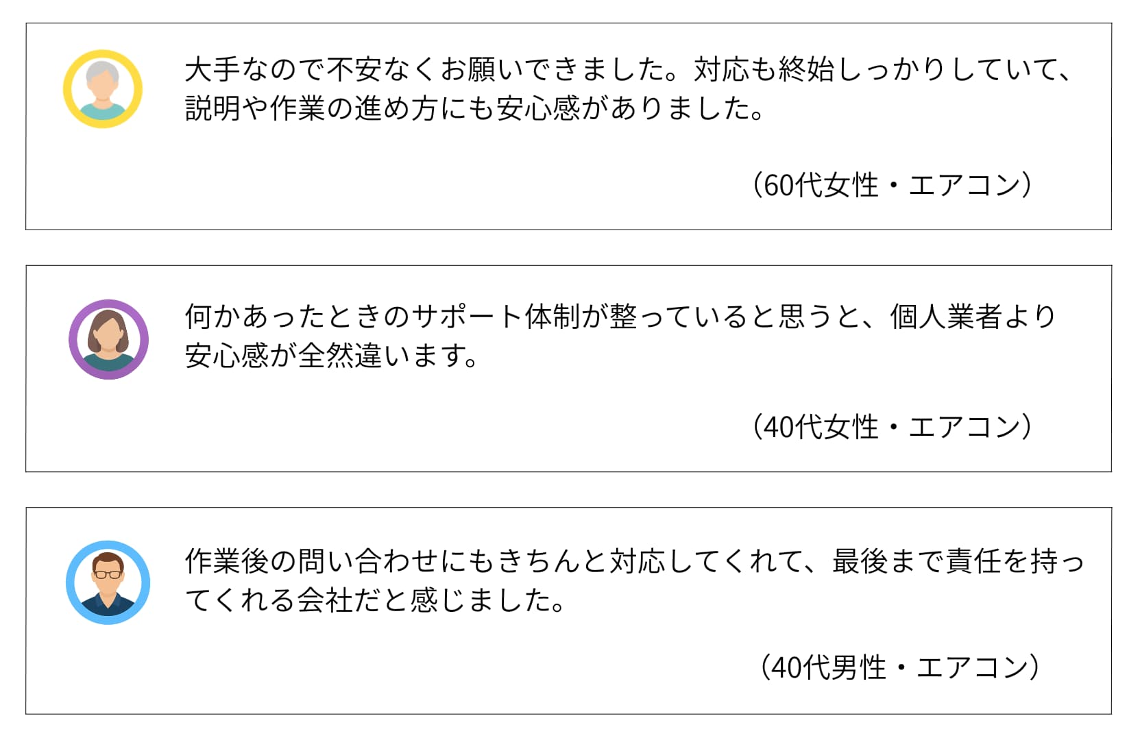 全国展開している企業であることに加え、研修やマニュアルによる品質管理が徹底されている点が、初めて依頼する人の不安を和らげています。