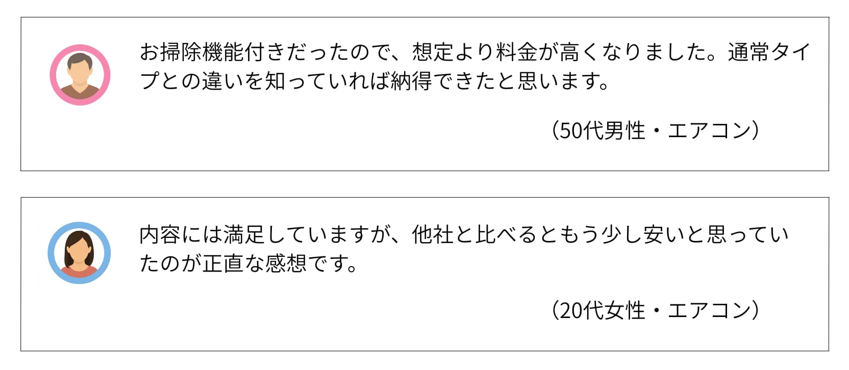 特に多いのが、お掃除機能付きエアコンを依頼した場合や、防カビコート・室外機洗浄などの追加オプションを付けたケースです。事前に説明を受けて納得したうえで依頼しているものの、最終的な金額を見て「思ったよりかかった」と感じる人もいるようです。