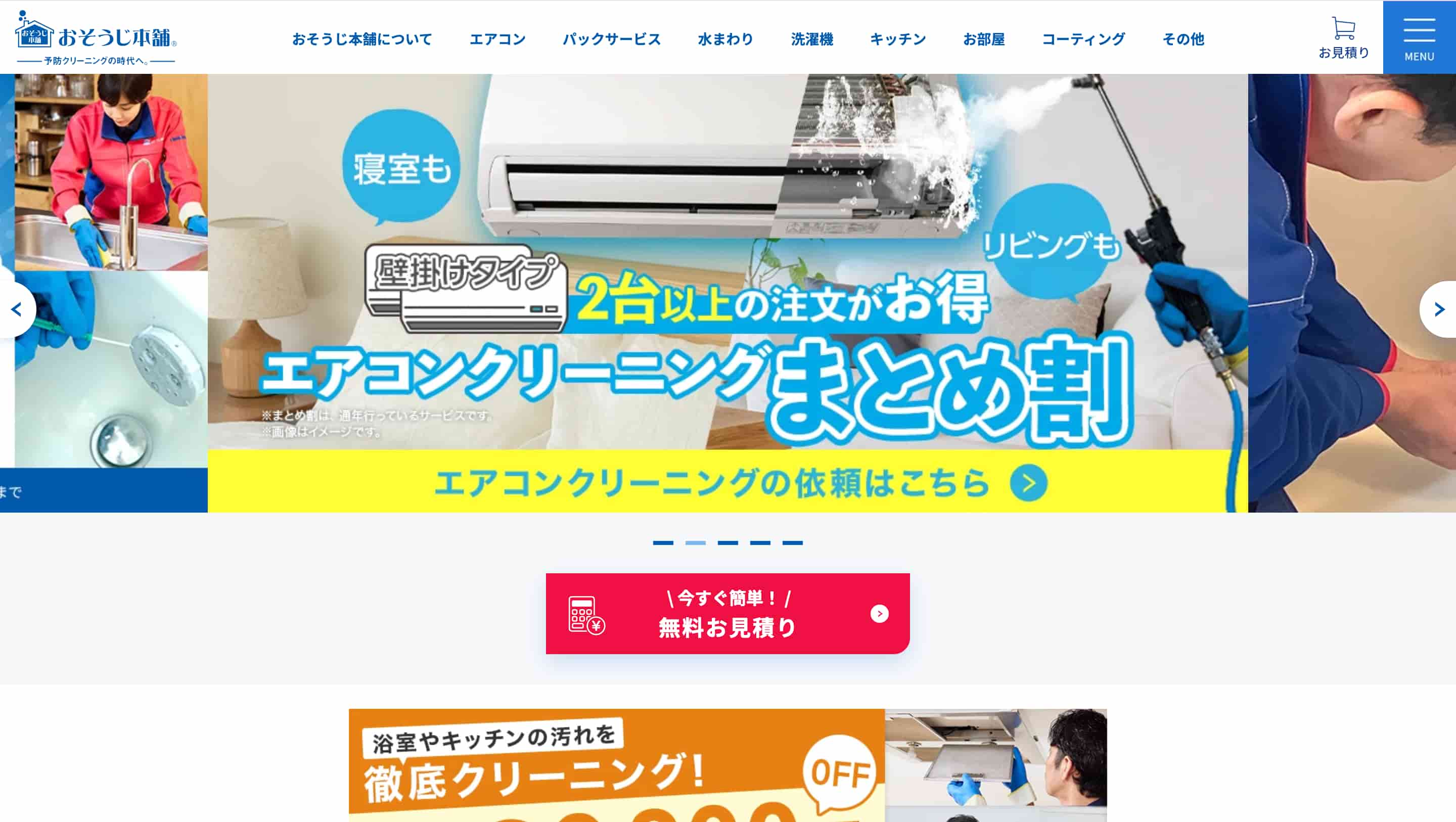 おそうじ本舗は、全国展開しているフランチャイズ型のハウスクリーニングサービスで、エアコン・水回りなど幅広い清掃に対応しています。全国に1,700店舗以上を構える業界トップクラスの規模で、エアコンクリーニングのイメージが強い方も多いかもしれませんが、キッチンや浴室、トイレ、換気扇、床清掃まで、家の中の気になるところは一通り対応しています。