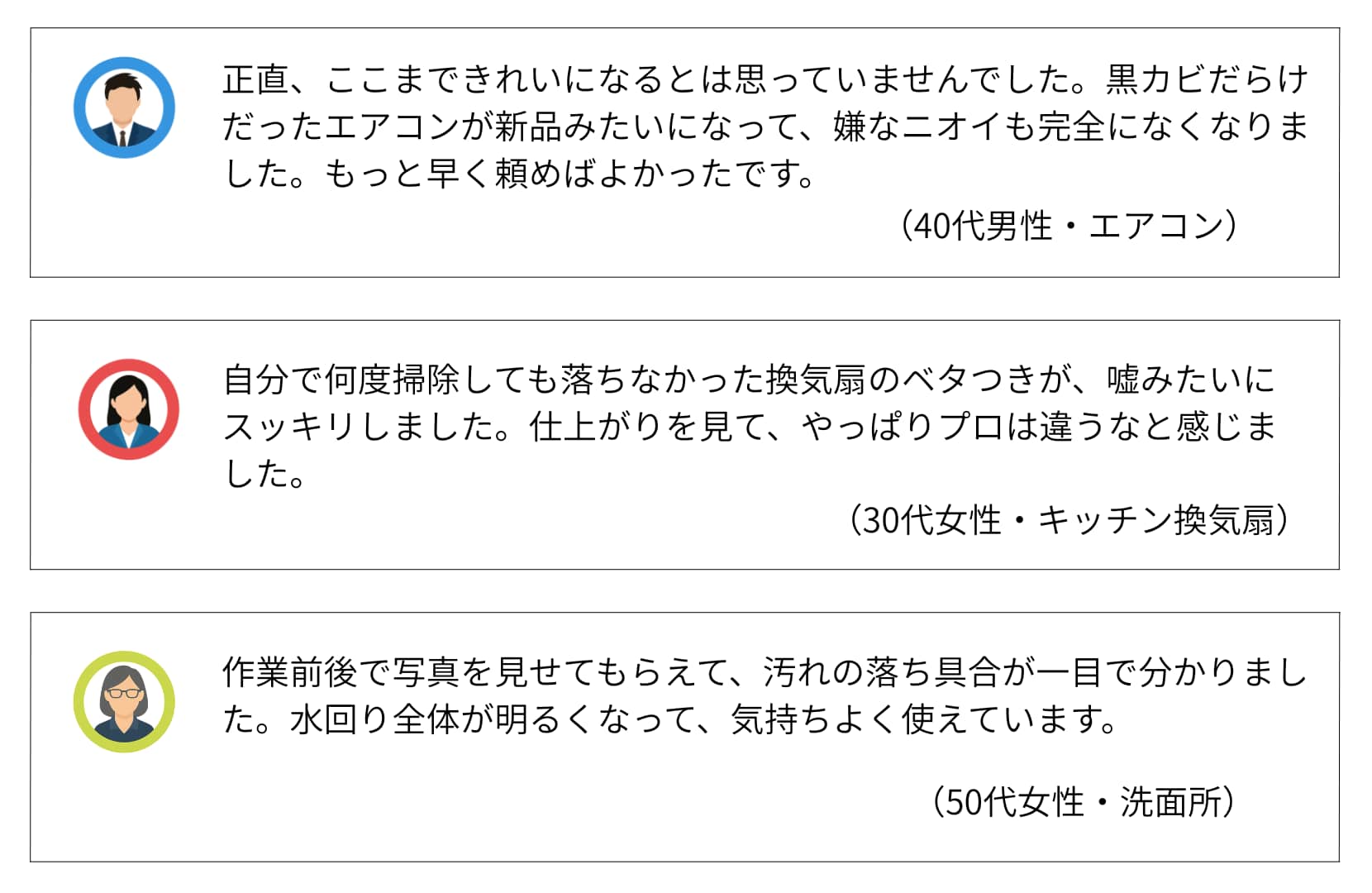 換気扇や水回りでも、頑固な汚れが一気に落ちたと感じる人が多く、プロならではの仕上がりが満足度につながっています。普段の掃除では限界を感じている人ほど、違いを実感しやすいですね。