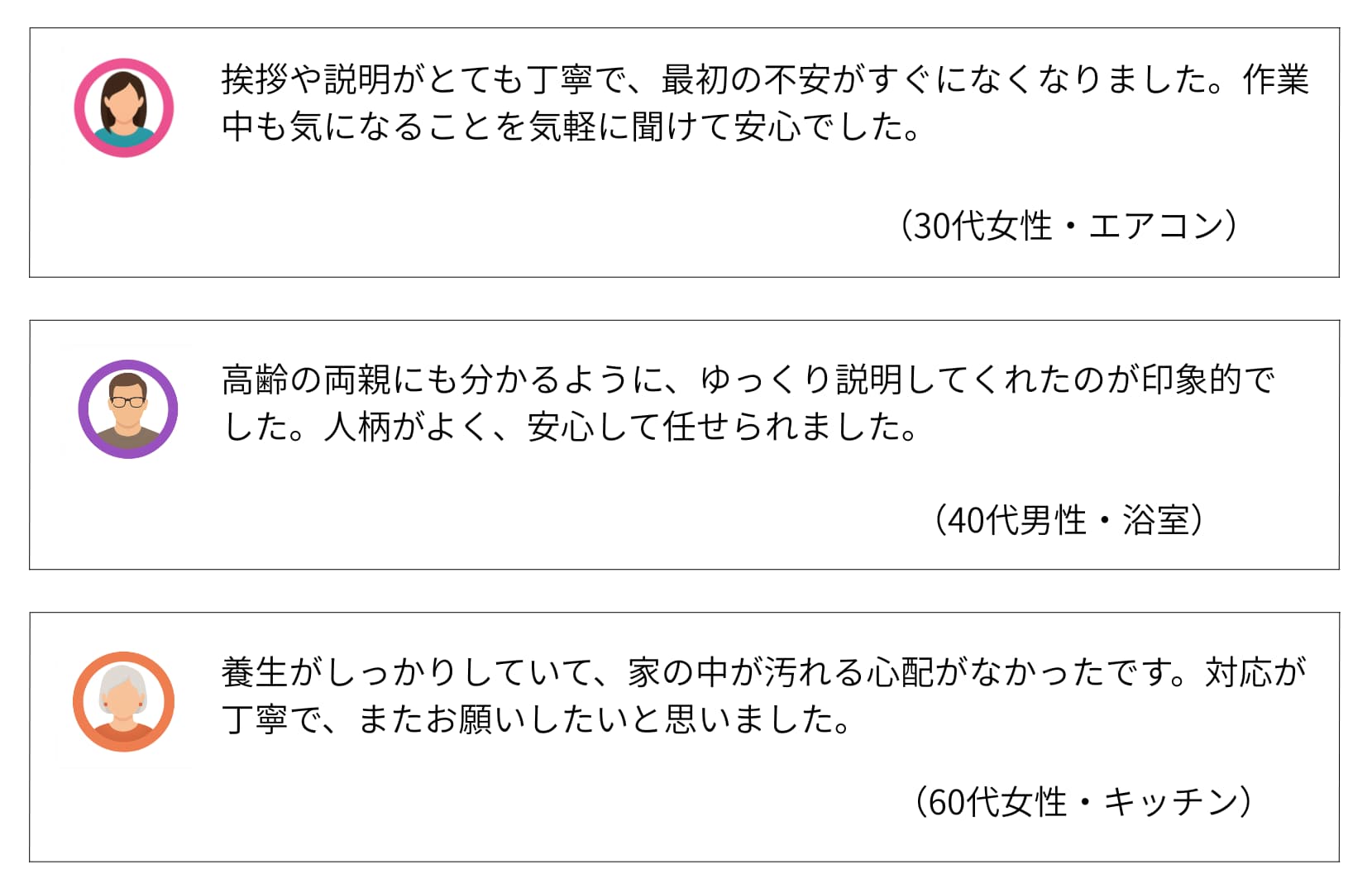 家に他人を入れる不安がある方でも、養生や配慮が行き届いていて安心できたという声があります。特に小さなお子さんや高齢の家族がいる家庭では、この丁寧さが信頼につながっているようです。初めてでも任せやすい対応と言えそうですね。
