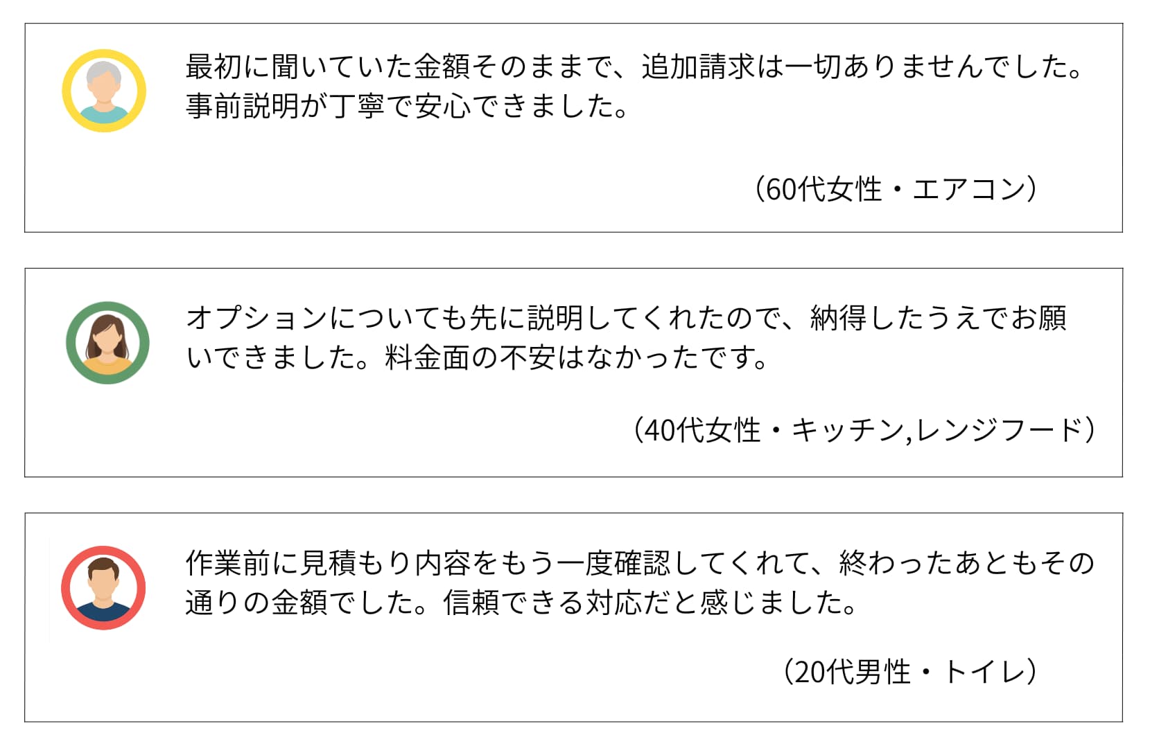 おそうじ本舗の口コミでは、料金面で安心できたという声も多く見られます。「見積もりどおりだった」「事前にオプションの説明があり納得できた」など、追加請求への不安が少なかったという評価が目立ちますね。