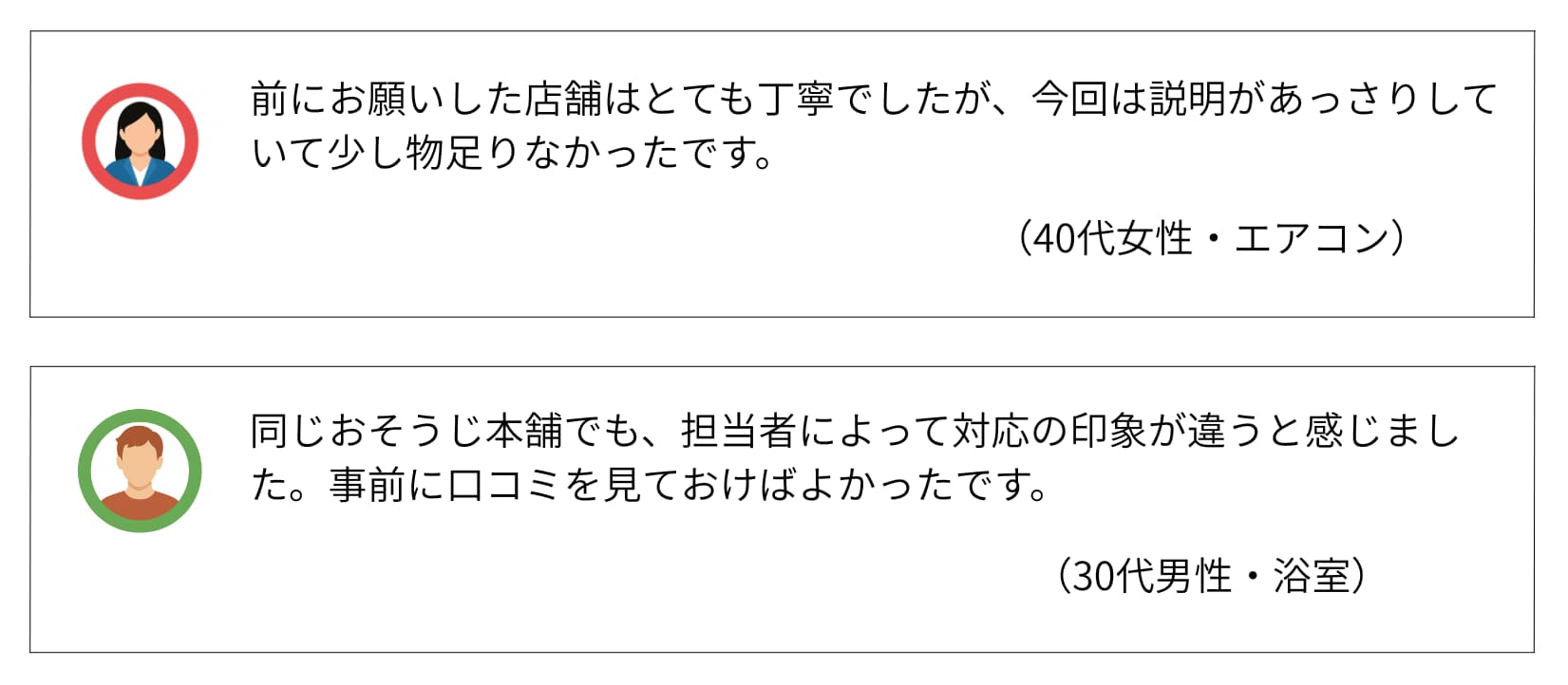 そのため基本的なサービス内容や流れは共通していますが、実際の作業品質や対応の丁寧さは担当者の経験や姿勢に左右されやすいのが実情です。だからこそ「すごく良かった」という声と、「思ったより普通だった」という口コミが混在するわけです。