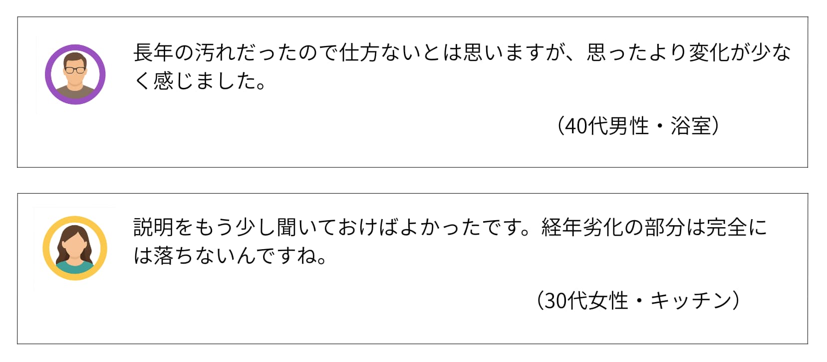 事前に「どこまできれいになるのか」をしっかり説明してもらわないと、期待とのズレが不満につながりやすくなります。作業前に仕上がりの限界を確認しておくことで、納得感はぐっと高まりますよ。