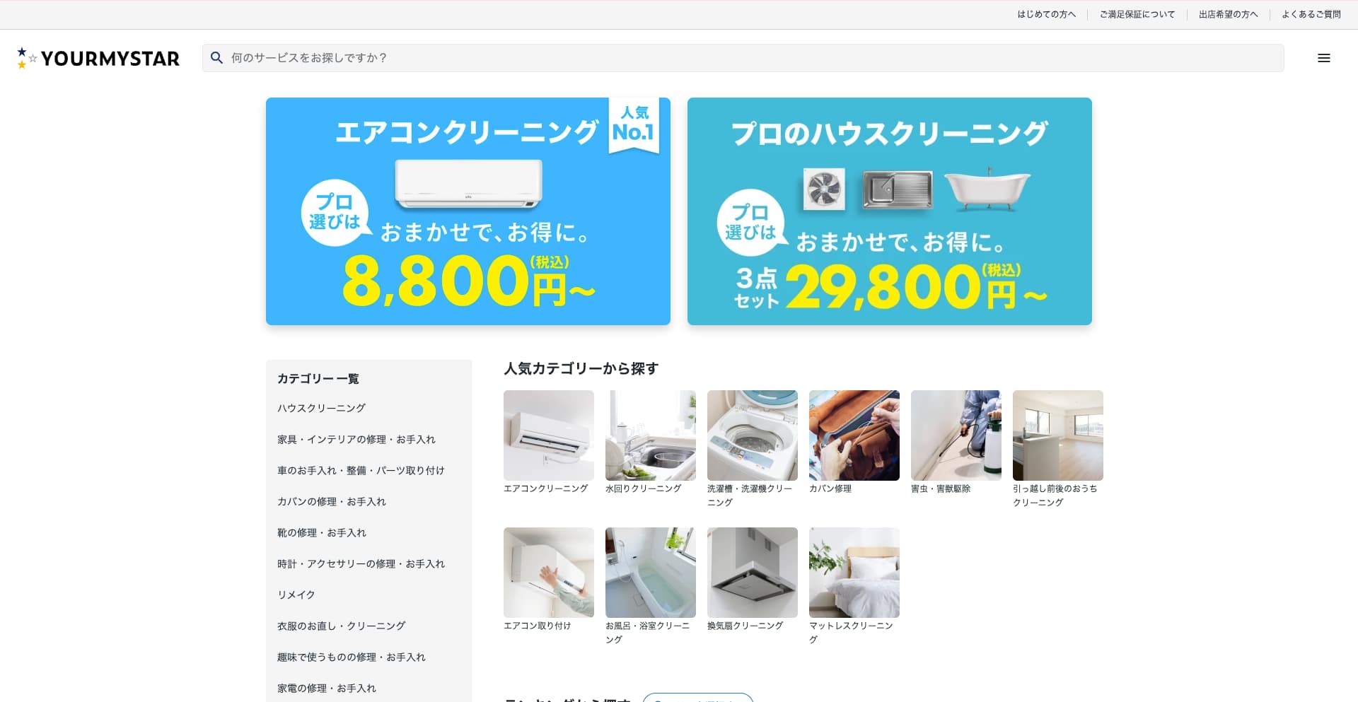 ユアマイスターは、ハウスクリーニングや修理・リフォームなどを依頼したいユーザーと、プロの業者をつなぐマッチング型サービスです。エアコンクリーニングや水回り清掃をはじめ、キッチン・浴室・トイレ・換気扇など、家庭内の作業に対応しています。