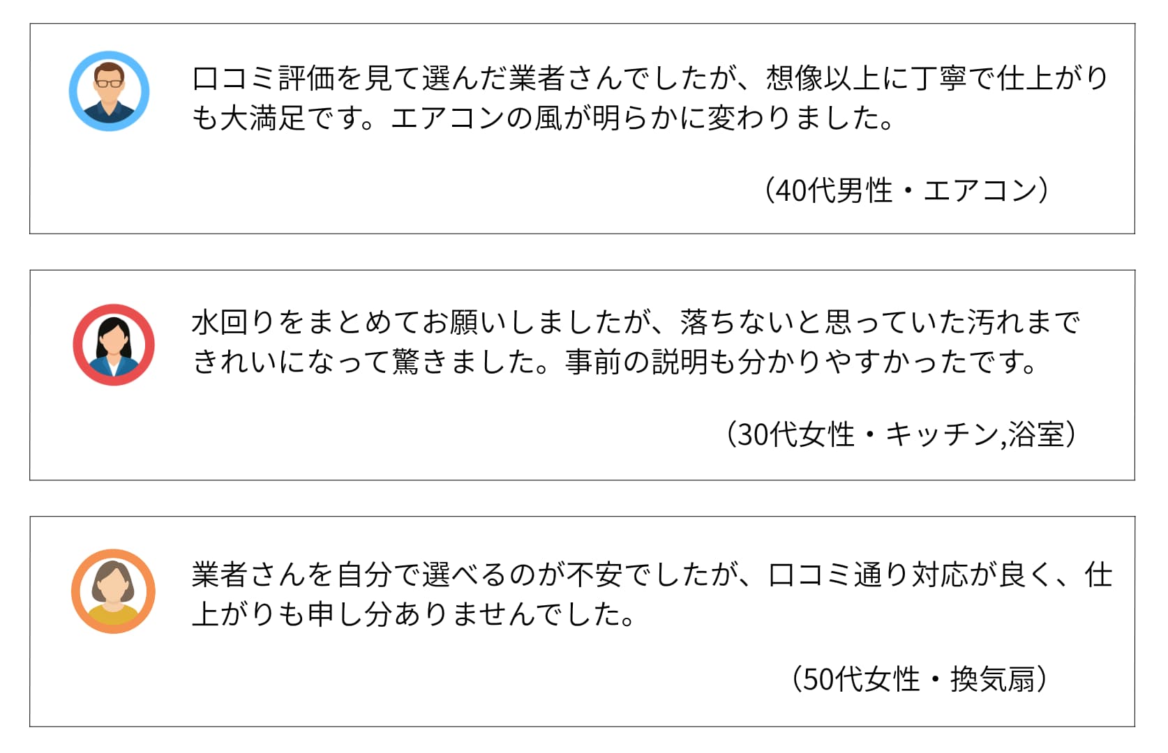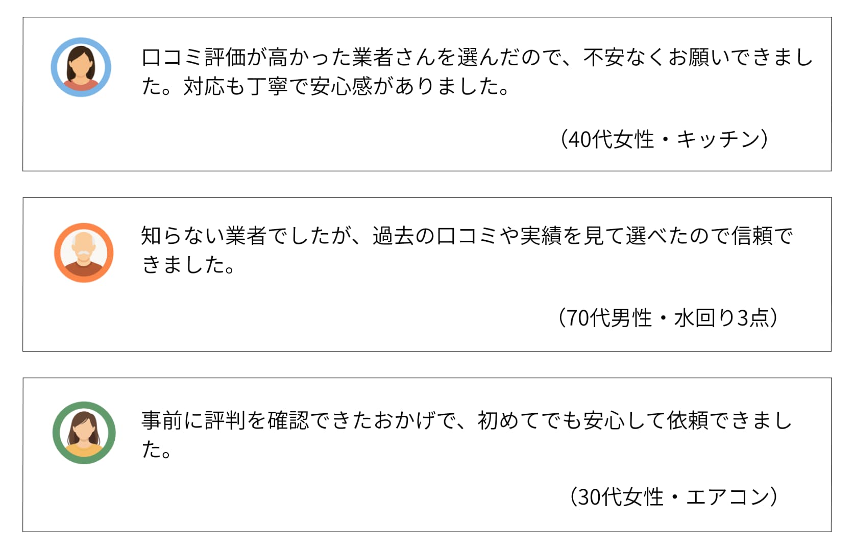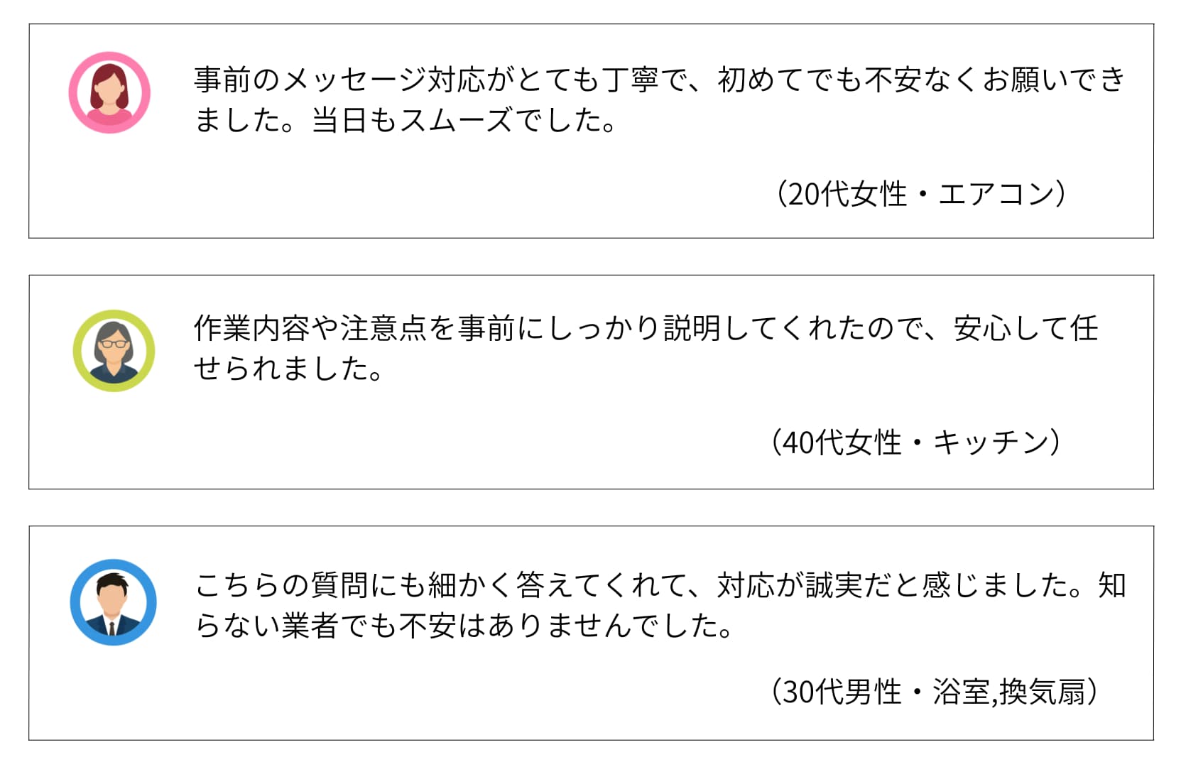 「質問にすぐ答えてくれた」「こちらの希望をしっかり聞いてくれた」など、対応の丁寧さが不安解消につながったという口コミも目立ちます。事前に人柄や対応を感じ取れるため、安心して依頼しやすいようです。