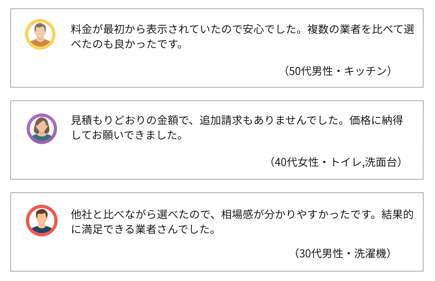 また、複数の業者を比較して選べる仕組みのため、「相見積もり感覚で検討できた」という口コミも目立ちます。価格だけでなく、口コミや対応内容も含めて判断できる点も安心材料です。