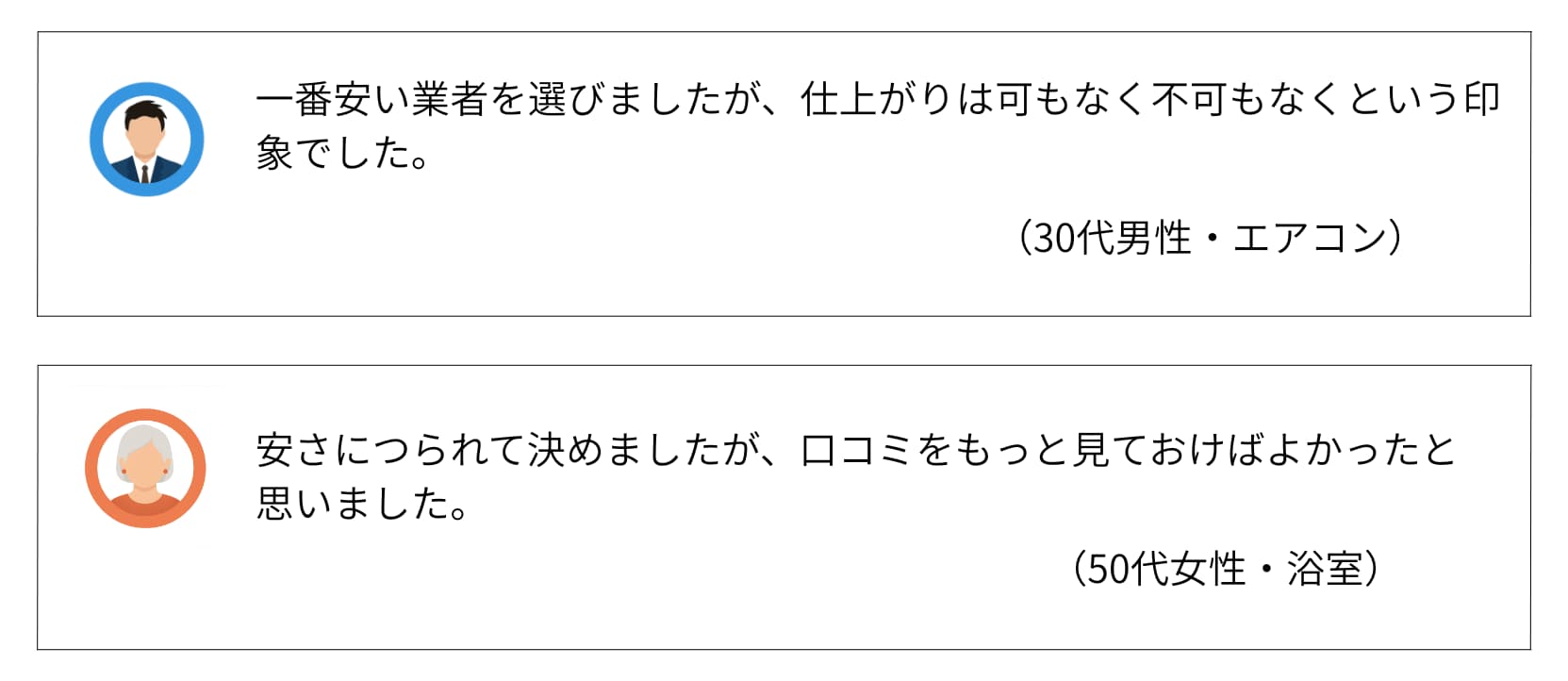 ユアマイスターの悪い口コミで見られるのが、「思っていたより仕上がりが普通だった」「安さで選んだら少し物足りなかった」といった声です。ユアマイスターでは料金が事前に表示されるため比較しやすい一方、価格だけで業者を選ぶと、対応や仕上がりに期待との差を感じる場合があります。