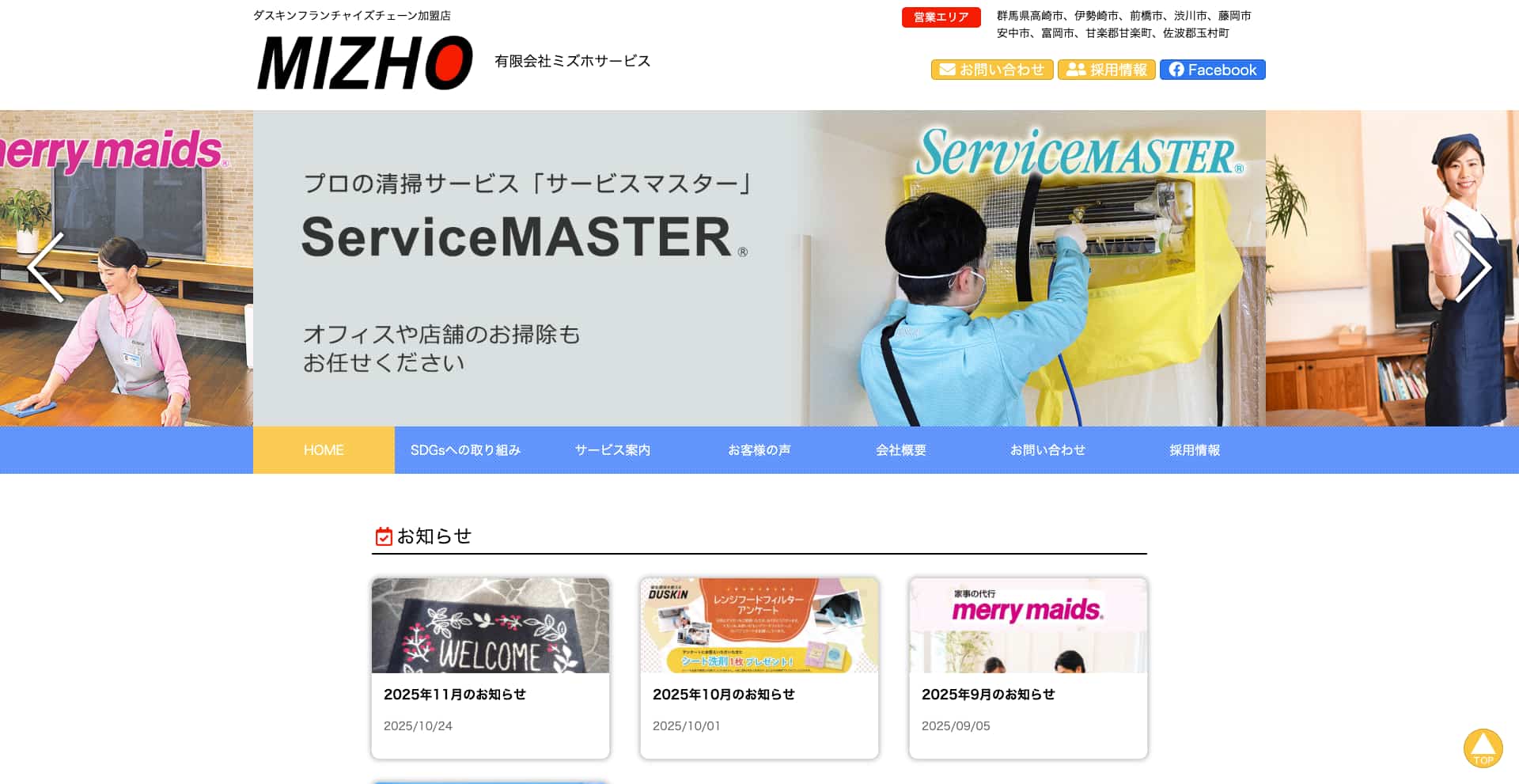 有限会社ミズホサービスは、群馬県高崎市に拠点を置き、ダスキン・フランチャイズチェーンの加盟店として「住まいを快適に、きれいにする」ことを理念に、お客様の暮らしに寄り添ったハウスクリーニングサービスを展開しています。エアコン内部の分解洗浄やレンジフードの油汚れ除去、浴室・洗面所・トイレなどの水まわり清掃、ガラス・サッシ・網戸のクリーニングまで、普段の掃除では落としきれない汚れをプロの技術で徹底的にきれいにします。