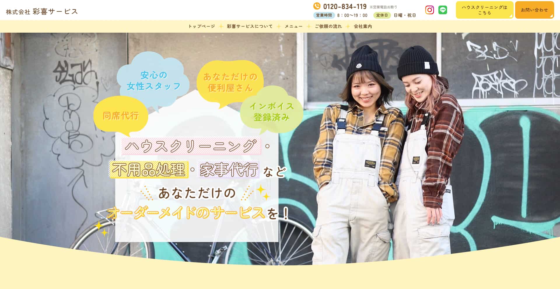 「彩喜サービス」は、埼玉県を拠点に、ハウスクリーニングをメインとした清掃サービスを提供する会社です。「安心・丁寧・信頼」を基本理念とし、エアコンや洗濯機、冷蔵庫などの家電クリーニングから、キッチン・換気扇・バスルーム・トイレ・洗面所などの水まわり清掃、さらには引っ越し前後の清掃まで、幅広いお掃除ニーズに応えています。