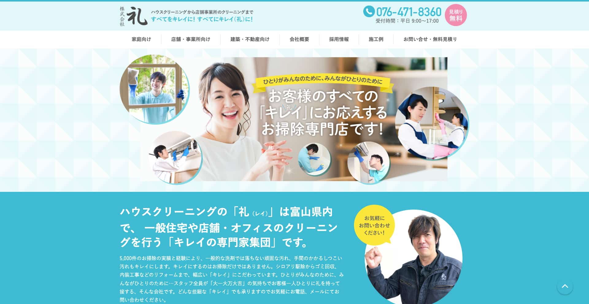 株式会社 礼は、富山県富山市を拠点に、一般住宅から店舗・オフィスまで幅広く対応するキレイの専門家集団です。一般的な洗剤では落ちにくい頑固な汚れや、手間のかかるしつこい汚れにも的確にアプローチし、「ただ掃除する」だけではなく、お客様の暮らしや空間をまるごと輝かせることを目指しています。ハウスクリーニングでは、エアコンクリーニング・水まわり・キッチンやレンジフード・換気扇・ガラス・サッシなど、住宅の“気になる”箇所を幅広くカバー。