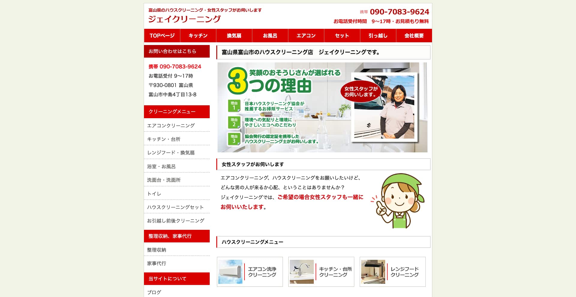 富山市を拠点に、住宅のトータルクリーニングサービスを提供する「ジェイクリーニング」は、地域密着で丁寧な対応に定評のあるハウスクリーニング専門店です。キッチンや浴室、レンジフード・換気扇などの水まわりはもちろん、トイレ・洗面所、エアコンクリーニング、窓ガラスやサッシ、ベランダ、床ワックスがけまで幅広く対応。
