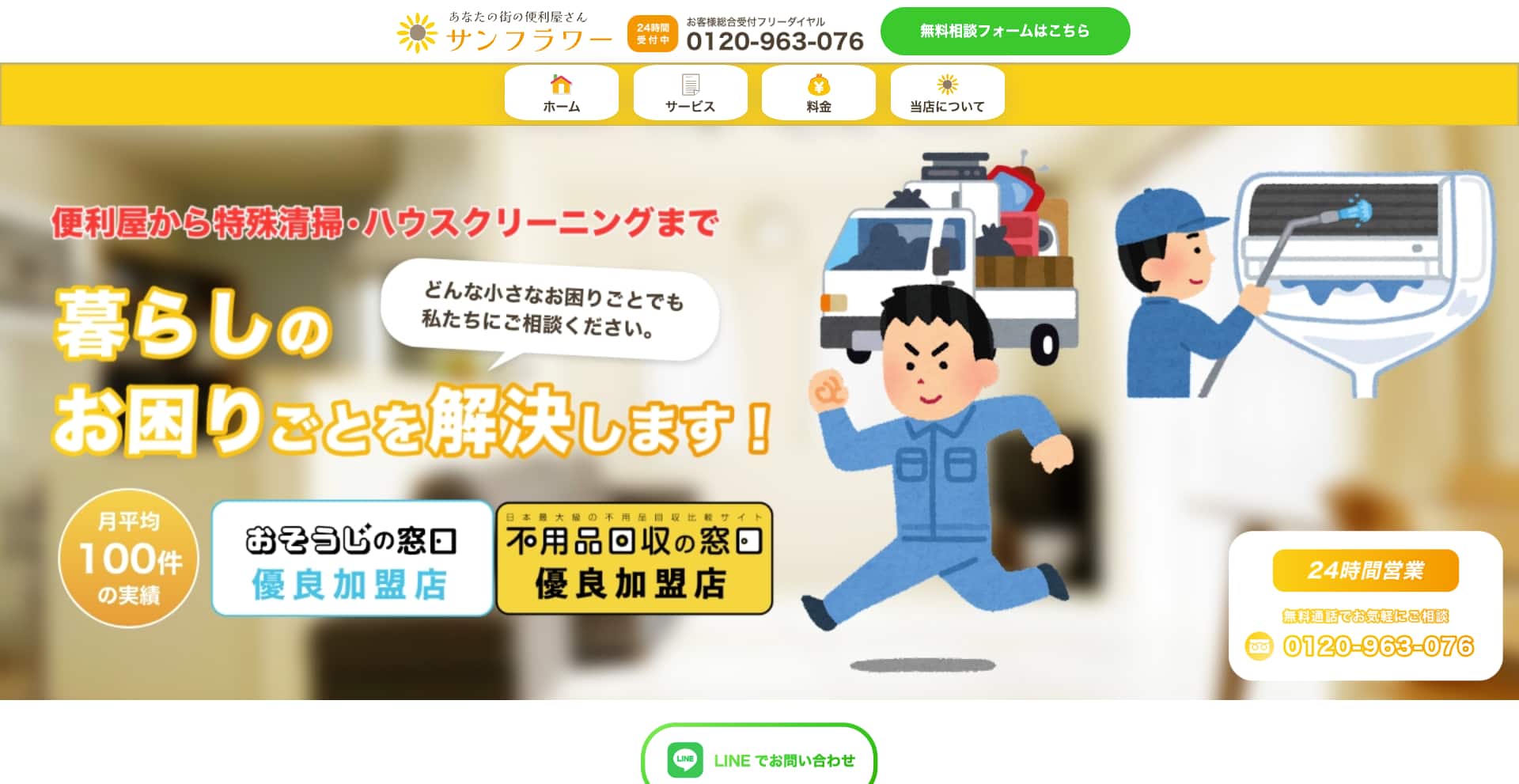 | サービス内容 | エアコン、キッチン、換気扇、浴室、トイレ、洗濯機、洗面台、ガラスサッシ、フロアコーティングなど |