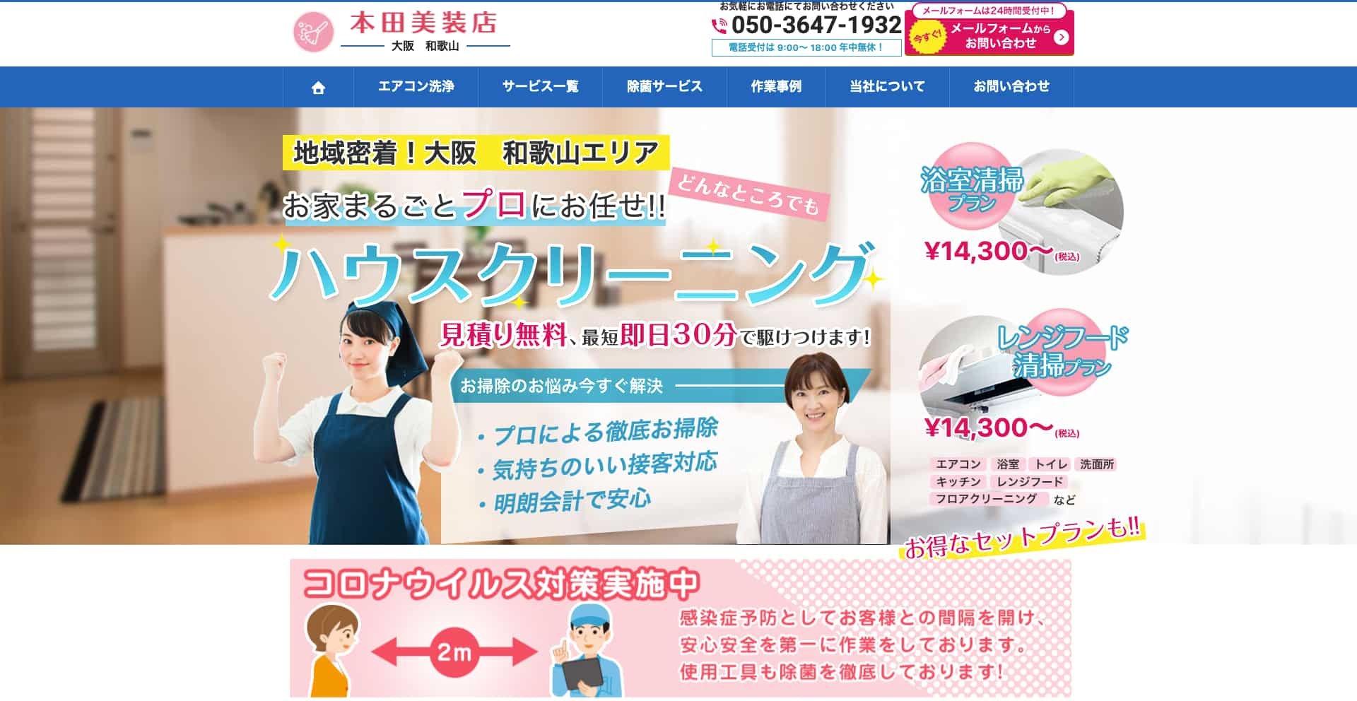 | サービス内容 | エアコン、キッチン、レンジフード、浴室、トイレ、洗面台、ガラス・サッシ、フローリングなど |