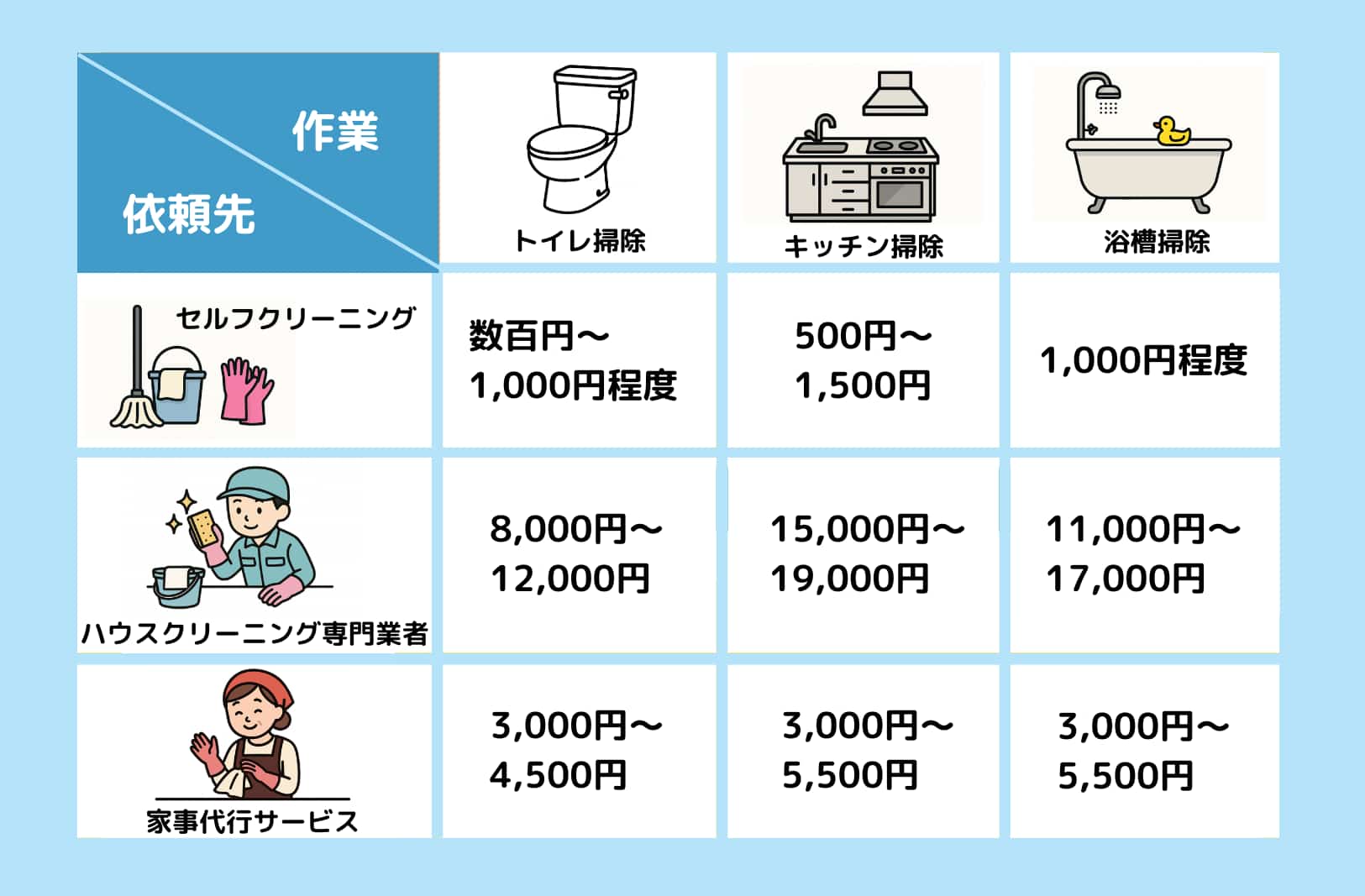 ハウスクリーニングの費用は、依頼先や掃除する場所、作業の範囲によって大きく異なります。主な依頼先である「個人でのセルフクリーニング」「家事代行サービス」「専門のハウスクリーニング業者」の3つを基準に、費用相場や特徴を比較してみましょう。